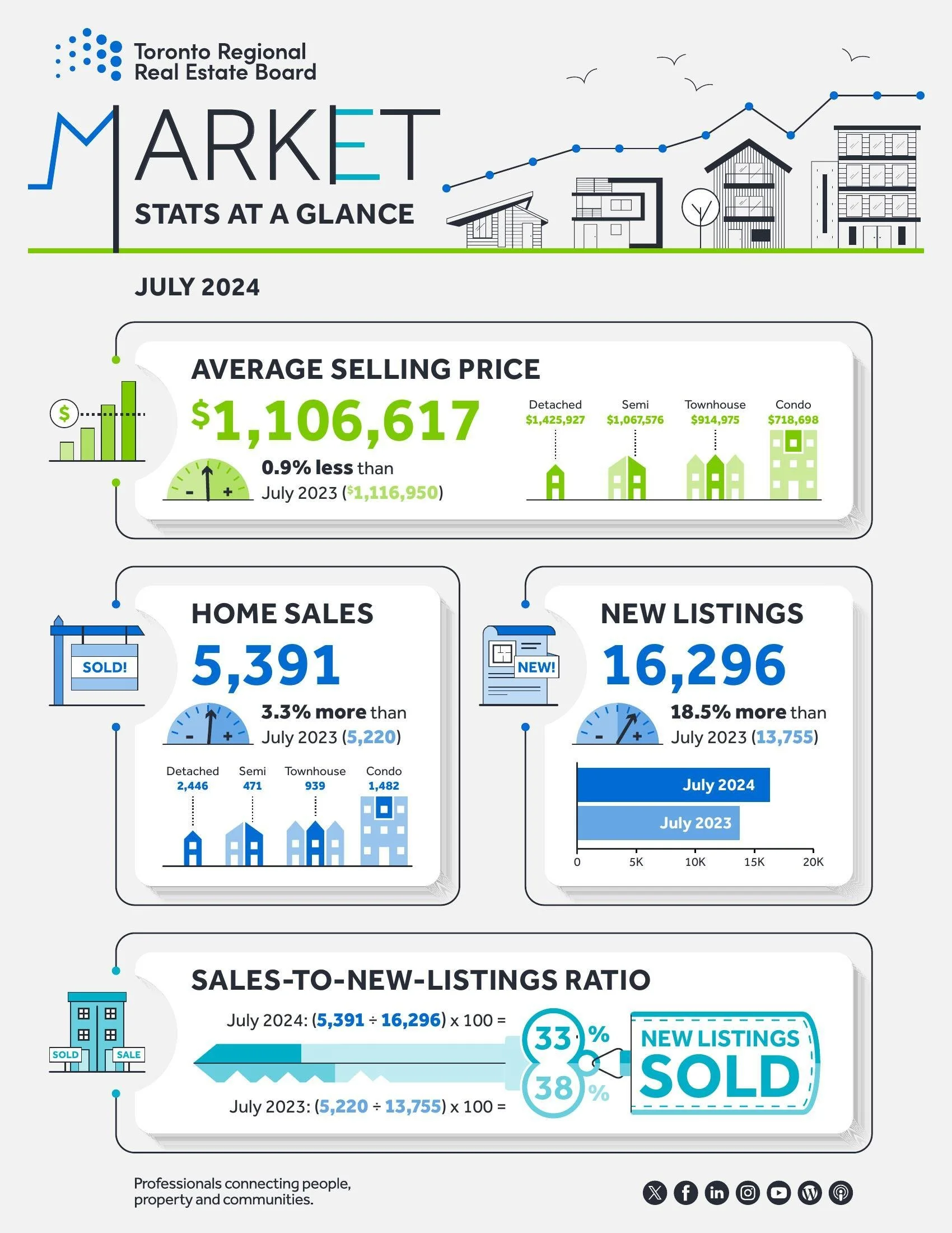 In July 2024, the Greater Toronto Area (GTA) housing market saw an uptick in home sales compared to the previous year, providing some optimism for both buyers and sellers. According to the Toronto Regional Real Estate Board (TRREB), home sales increased by 3.3% year-over-year, with 5,391 homes sold through TRREB's MLS® system.